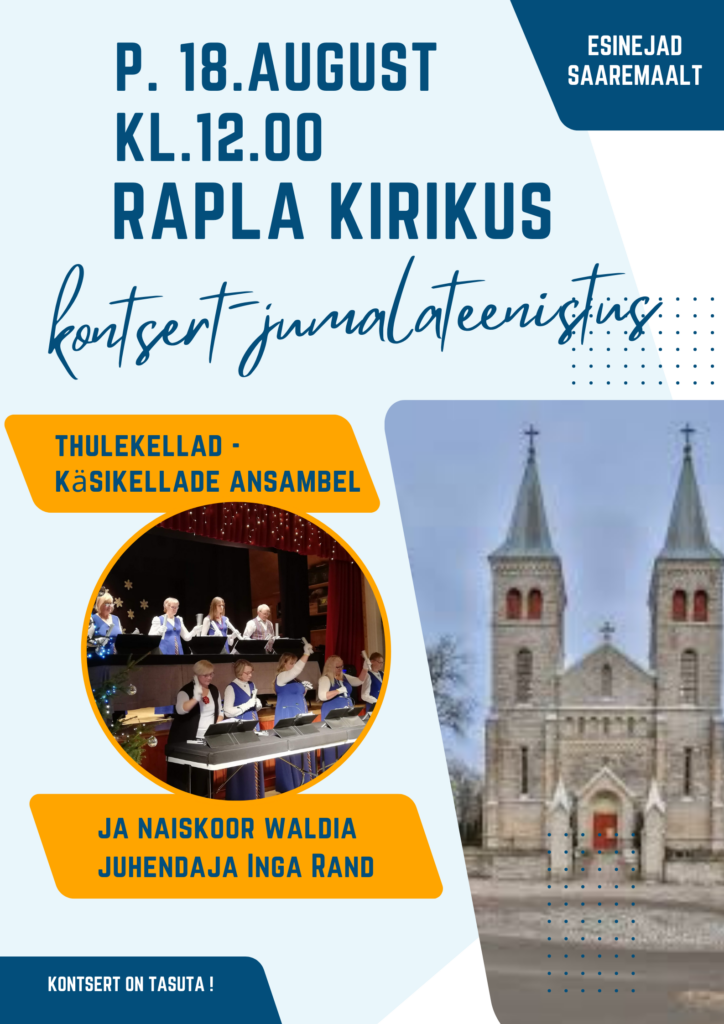 Pühapäeval, 18.augustil 2024 algusega kl 12 toimub kontsertjumalateenistus Rapla kirikus. Tulemas on esinejad Saaremaalt, käsikellade ansambel “Thulekellad” ja naiskoor Waldia, juhendaja Inga Rand. Kontsert on tasuta.