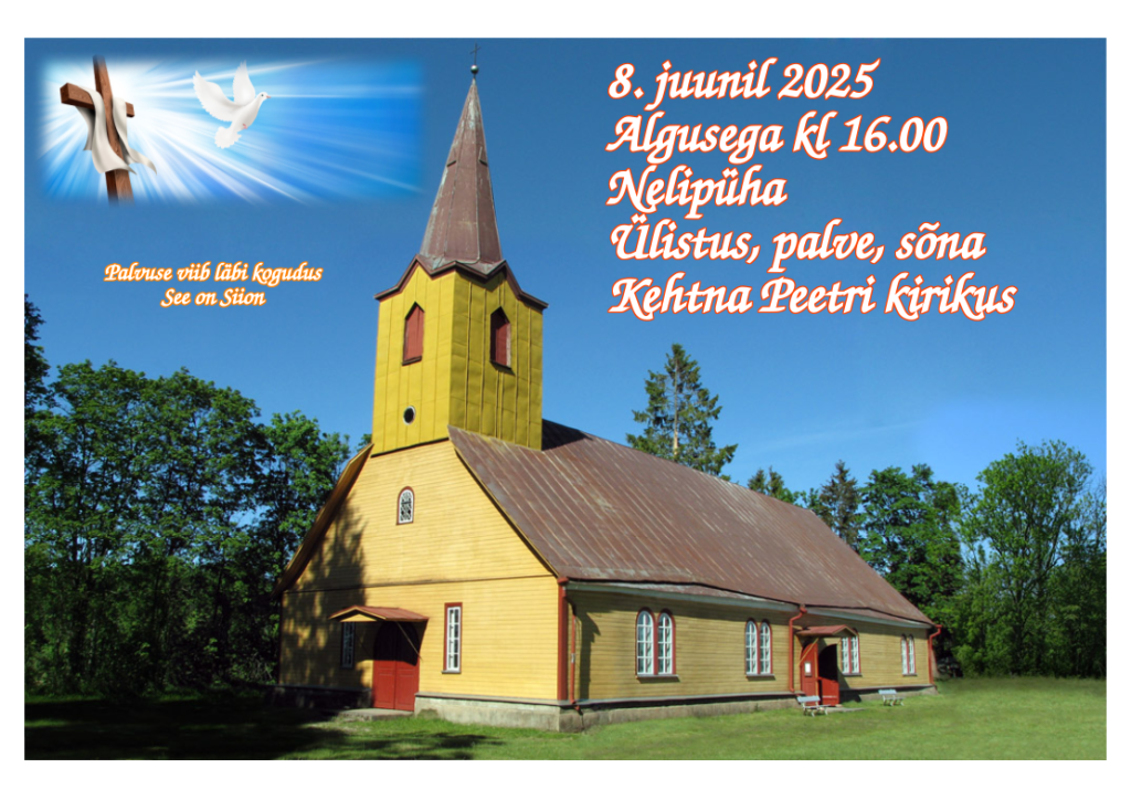 8.juunil kl 16 nelipüha Kehtna Peetri kirikus 4. mai 2025 by Edmund Laugasson 8. juunil 2025 Algusega kl 16.00 Nelipüha ülistus, palve, sõna Kehtna Peetri kirikus https://fb.me/e/2v8PxmnD9