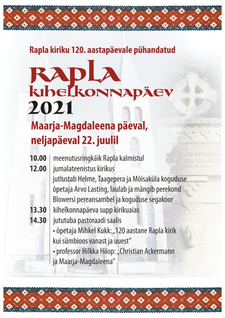 Rapla kiriku 120. aastapäevale pühendatud Rapla kihelkonnapäev toimub neljapäeval, 22.juulil 2021, Maarja-Magdaleena päeval, algusega kl 10 Rapla kalmistul. Kogu päeva kava on nähtav lisatud plakatilt.