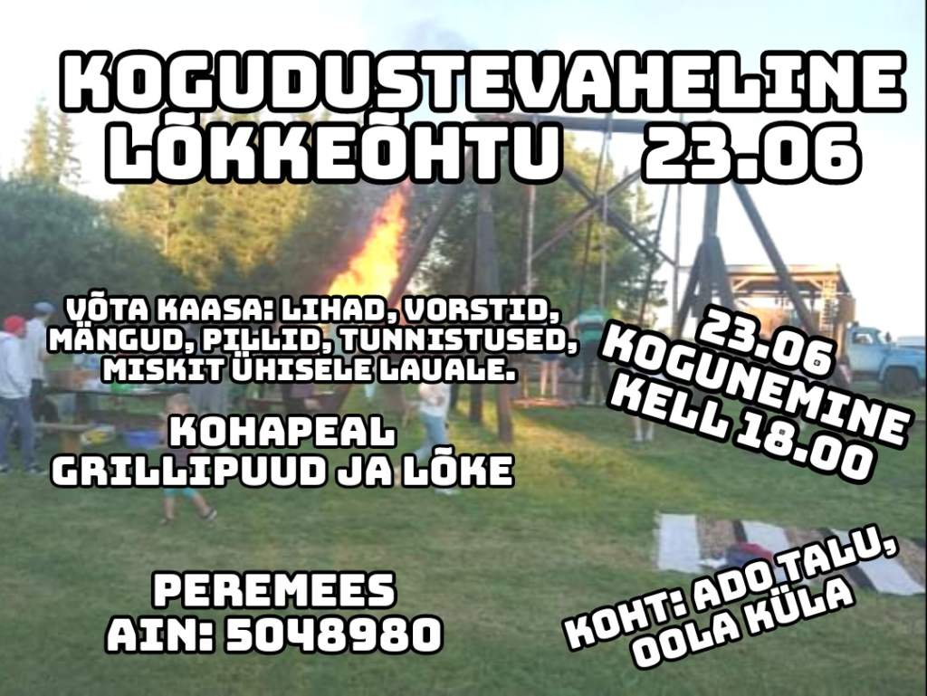 Kogunemine 23.juunil 2022 kell 18.00. Võta kaasa: lihad, vorstid, mängud, pillid, tunnistused, miskit ühisele lauale. Kohapeal grillipuud ja lõke. Peremees Ain tel +3725048980. Asukoht: Ado talu, Oola küla, Raplamaa. Google’i kaardilt saab otsida: Virpi tee Oola, Rapla maakond. Sama otsing ka Waze’i kaardilt.