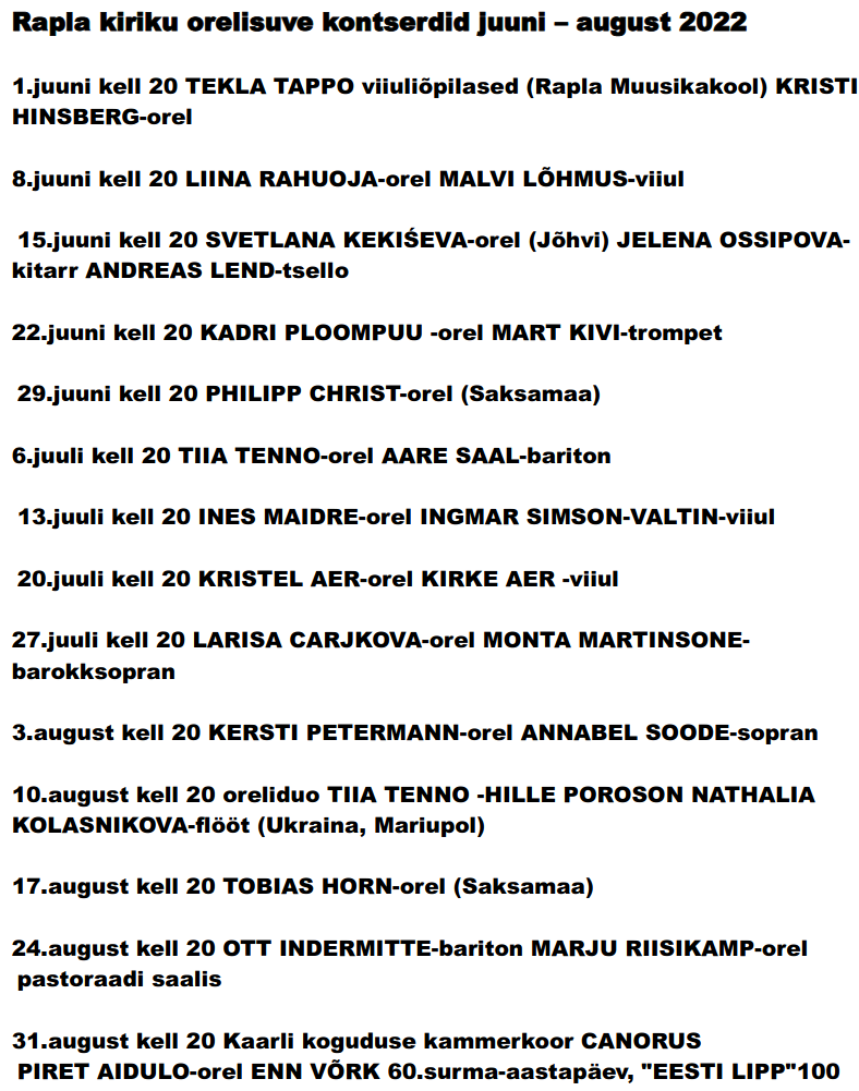 Rapla orelisuve kontserdid juuni-august 2022 23. juuni 2022 by Edmund Laugasson Rapla orelisuve kontserdid toimuvad kolmapäeviti algusega kl 20.00 Rapla kirikus. Sama kava ka PDF-failina.