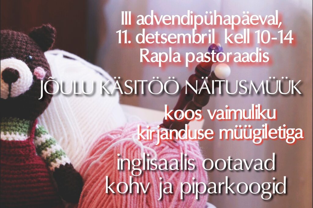 III advendipühapäeval, 11.detsembril kl 10-14 toimub Rapla pastoraadis jõulu käsitöö näitusmüük koos vaimuliku kirjanduse müügiletiga. Inglisaalis ootavad kohv ja piparkoogid.