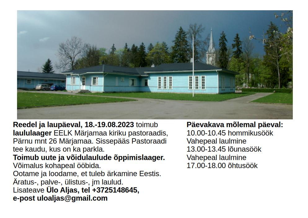 Reedel ja laupäeval, 18.-19.08.2023 toimub laululaager EELK Märjamaa kiriku pastoraadis, Pärnu mnt 26 Märjamaa. Sissepääs Pastoraadi tee kaudu, kus on ka parkla.