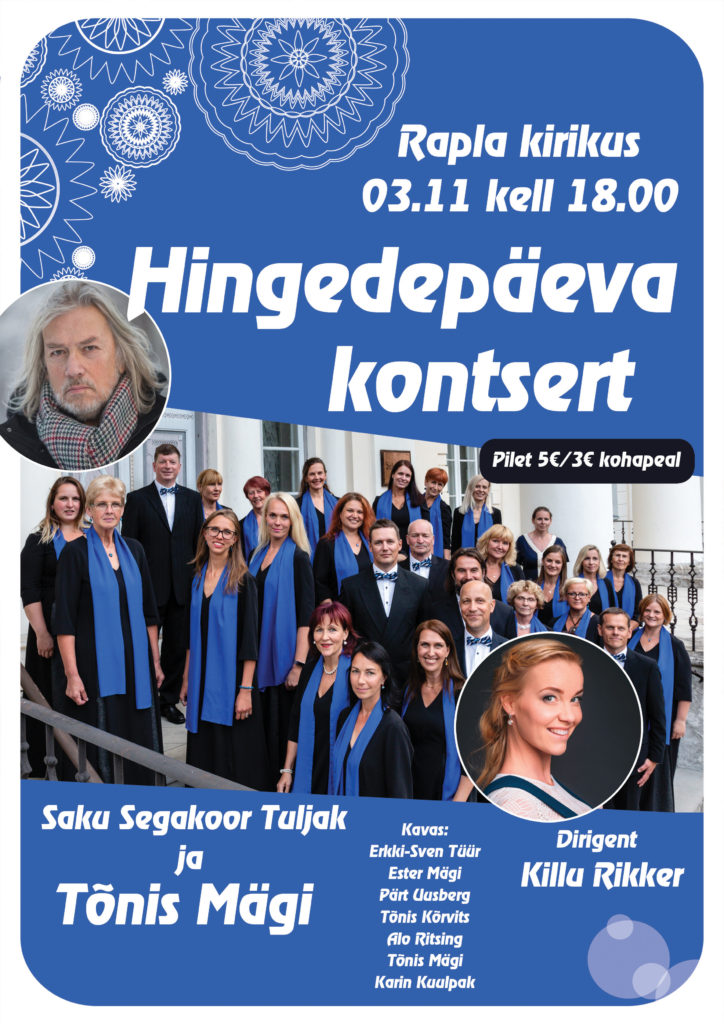 Kontsert toimub 3.11.2019 kell 18.00 Rapla Maarja-Magdaleena kirikus, kus teie ette astuvad Saku Segakoor Tuljak ja Tõnis Mägi (dirigeerib Killu Rikker). Tulge kuulama!