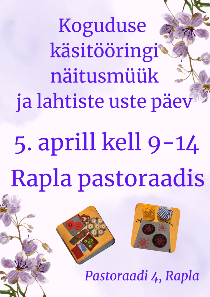 Koguduse käsitööringi näitusmüük 26. märts 2026 by Taavi Maiberg Koguduse käsitööringi näitusmüük ja lahtiste uste päev 5 aprillil kell 9-14 Rapla pastoraadis (pastoraadi 4).