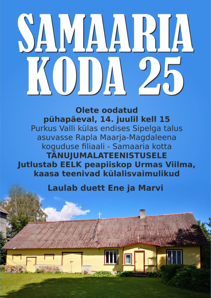 Olete kõik kutsutud pühapäeval, 14.juulil kell 15 osalema Purkus Valli külas (endise Järvakandi mõisa varemete lähedal) asuva Rapla koguduse filiaali – Samaaria koja pühitsemise 25. aastapäeva tänujumalateenistusel.