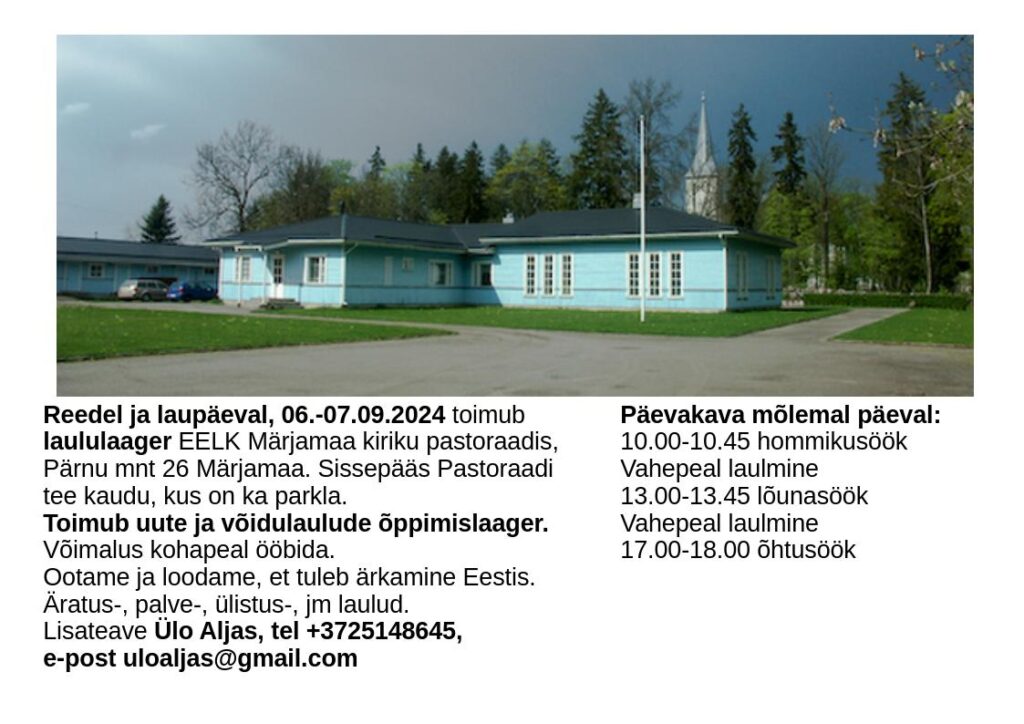 Reedel ja laupäeval, 06.-07.09.2024 toimub laululaager EELK Märjamaa kiriku pastoraadis, Pärnu mnt 26 Märjamaa. Sissepääs Pastoraadi tee kaudu, kus on ka parkla.